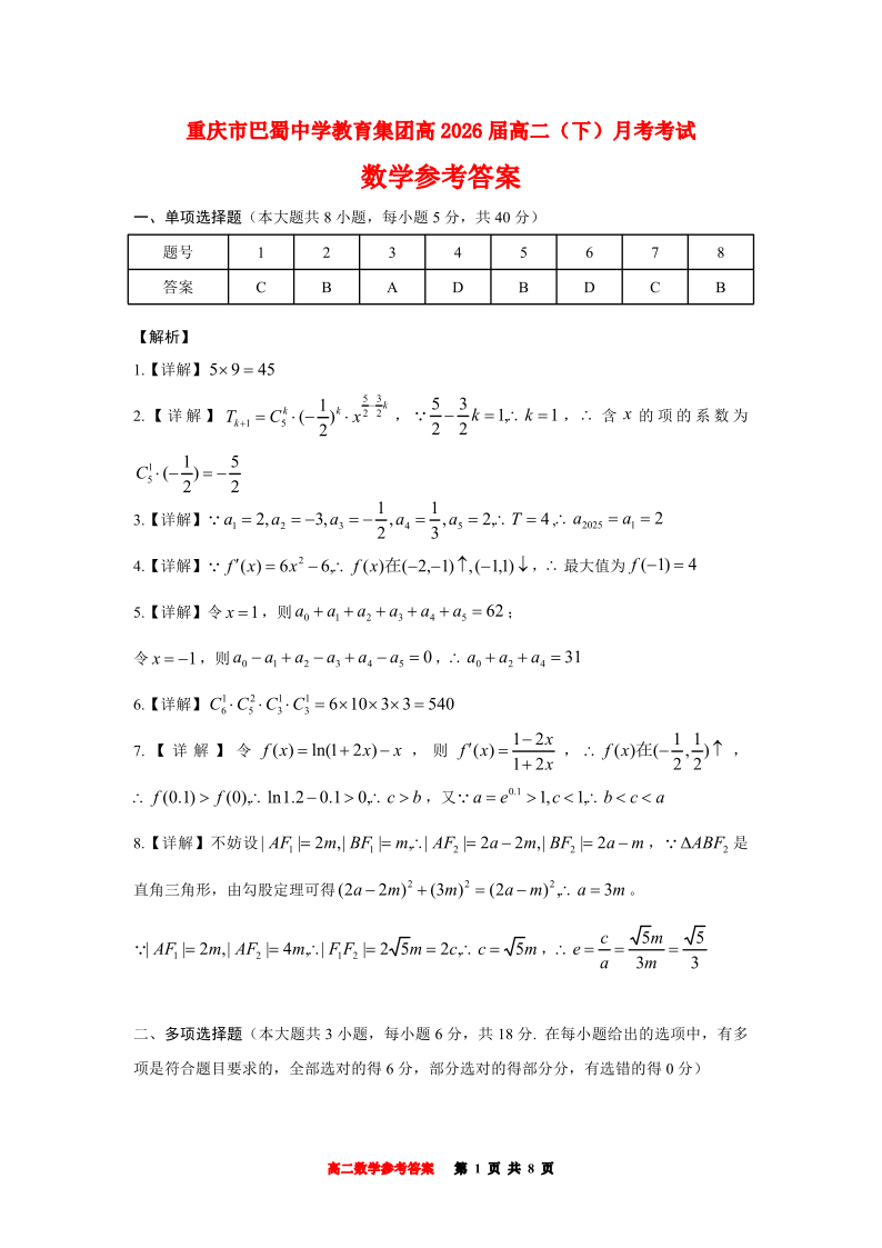 重庆市巴蜀中学2024-2025学年下学期3月高二月考数学答案