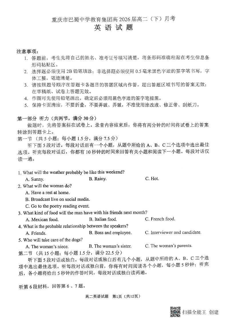 重庆市巴蜀中学2024-2025学年下学期3月高二月考英语