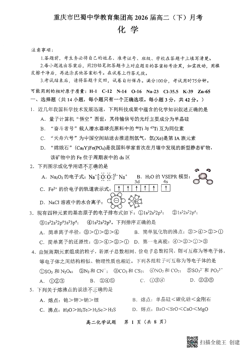 重庆市巴蜀中学2024-2025学年下学期3月高二月考化学