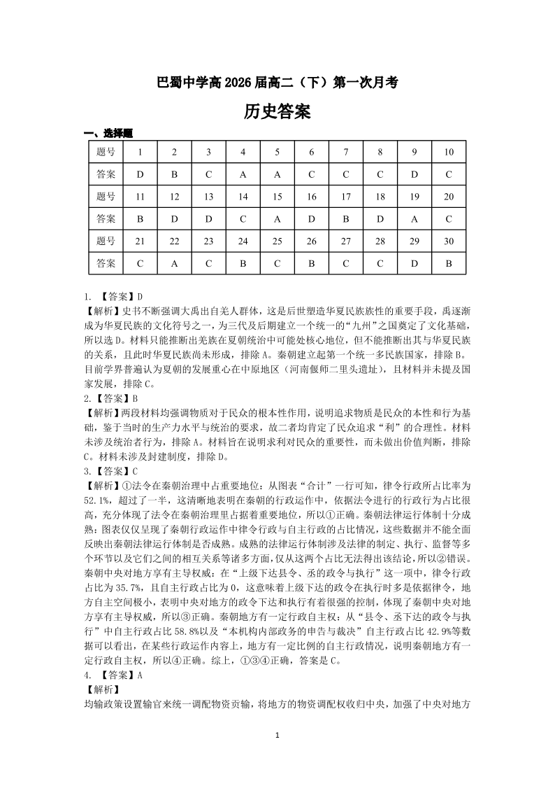 重庆市巴蜀中学2024-2025学年下学期3月高二月考历史答案