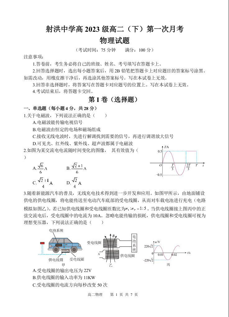 四川省遂宁市射洪中学2024-2025学年下学期3月高二月考物理