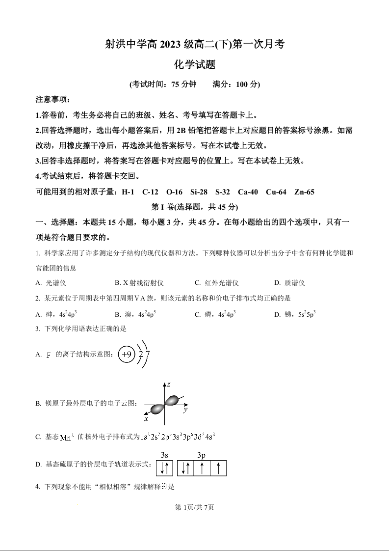 四川省遂宁市射洪中学2024-2025学年下学期3月高二月考化学(原卷版)