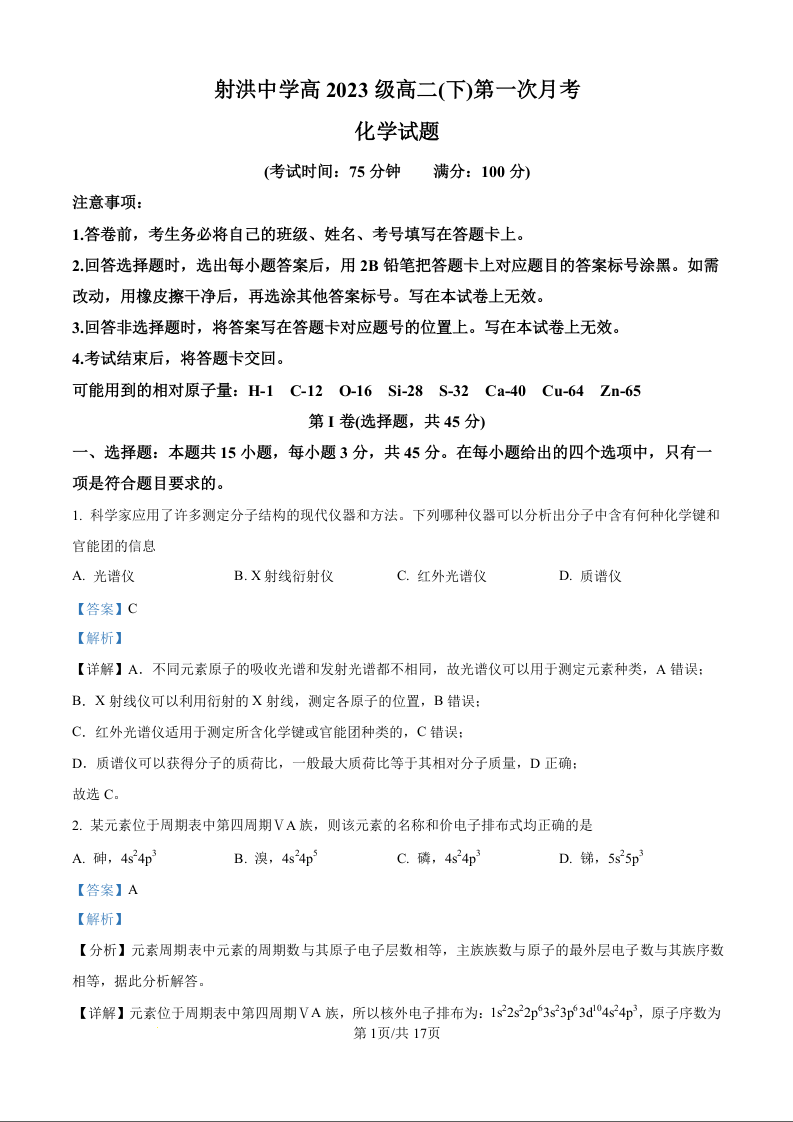 四川省遂宁市射洪中学2024-2025学年下学期3月高二月考化学(精品解析版)