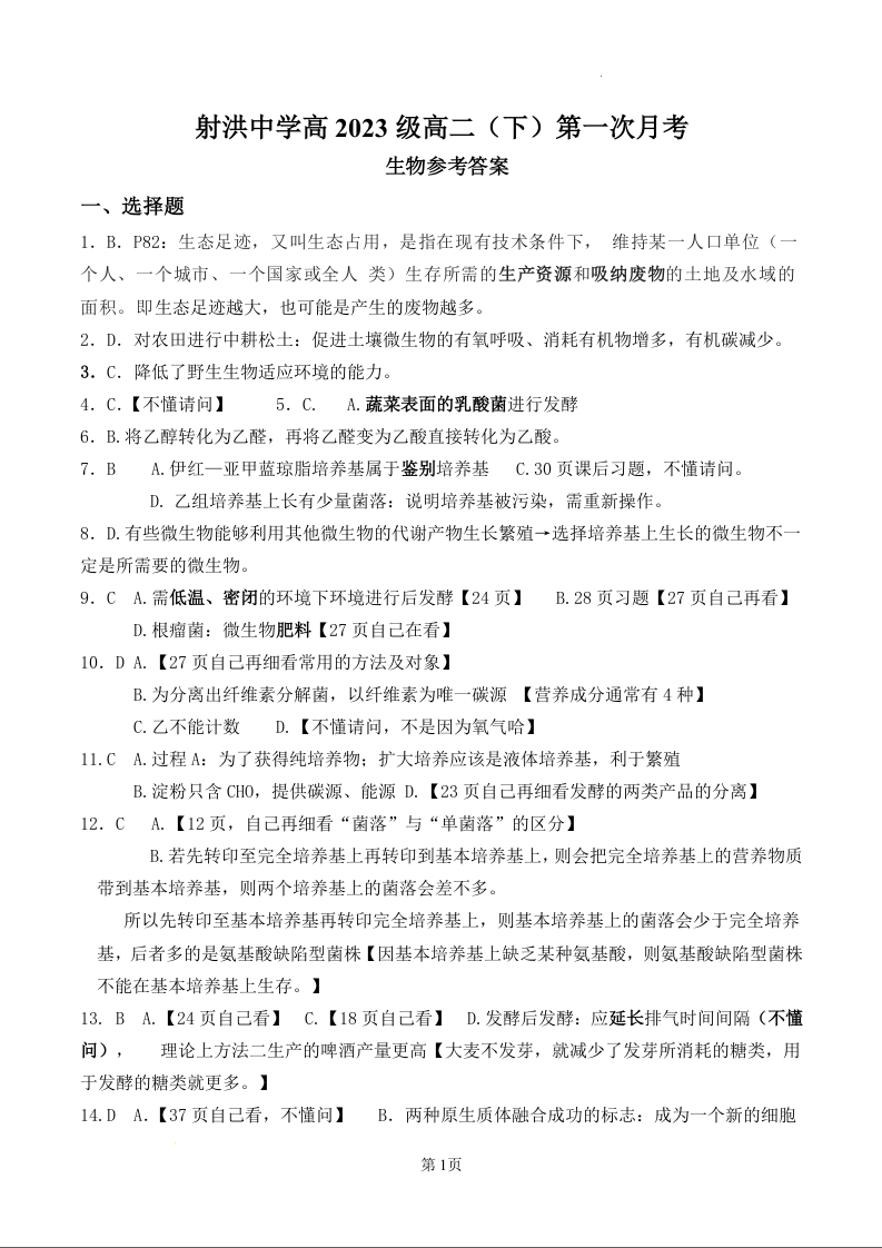 四川省遂宁市射洪中学2024-2025学年下学期3月高二月考生物答案