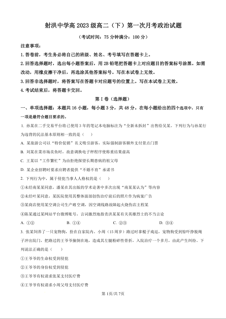 四川省遂宁市射洪中学2024-2025学年下学期3月高二月考政治(原卷版)
