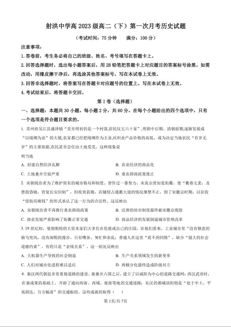 四川省遂宁市射洪中学2024-2025学年下学期3月高二月考历史(原卷版)