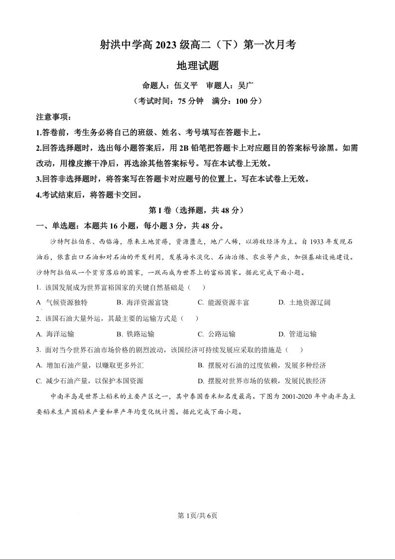 四川省遂宁市射洪中学2024-2025学年下学期3月高二月考地理(原卷版)