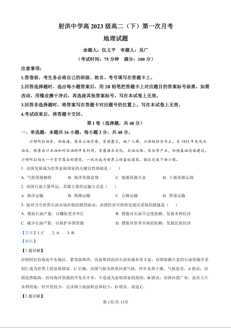 四川省遂宁市射洪中学2024-2025学年下学期3月高二月考地理(精品解析版)