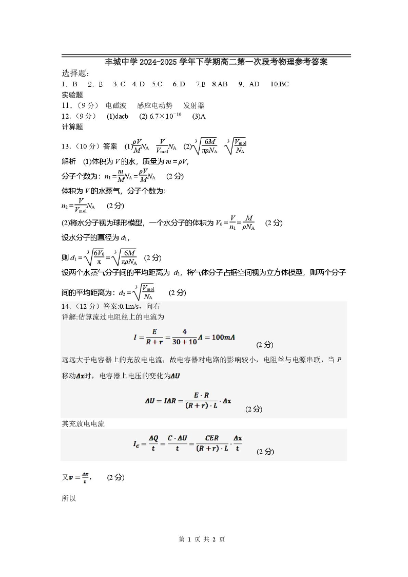 江西省丰城中学2024-2025学年下学期3月高二第一次段考物理答案