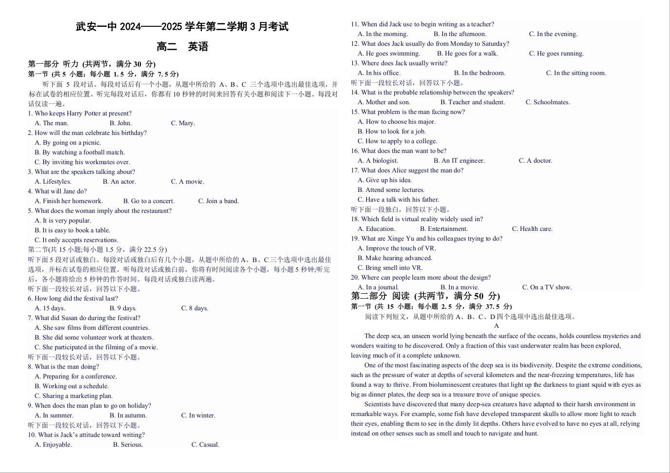 河北省邯郸市武安一中2024-2025学年下学期3月高二月考英语