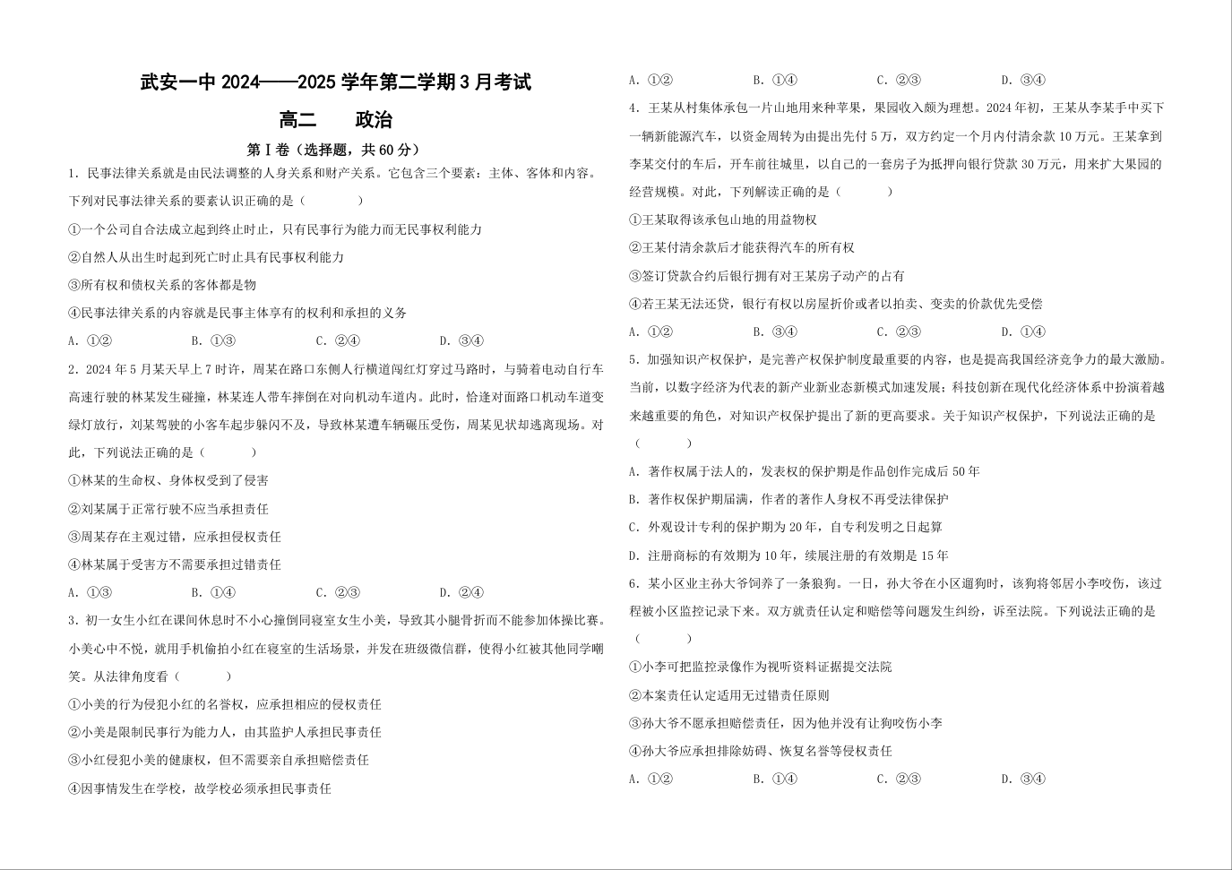 河北省邯郸市武安一中2024-2025学年下学期3月高二月考政治