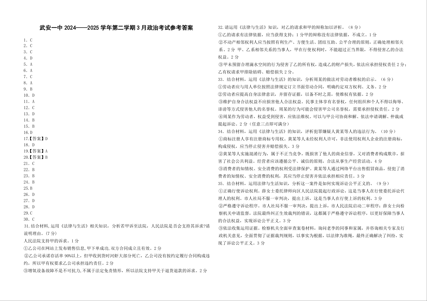 河北省邯郸市武安一中2024-2025学年下学期3月高二月考政治答案