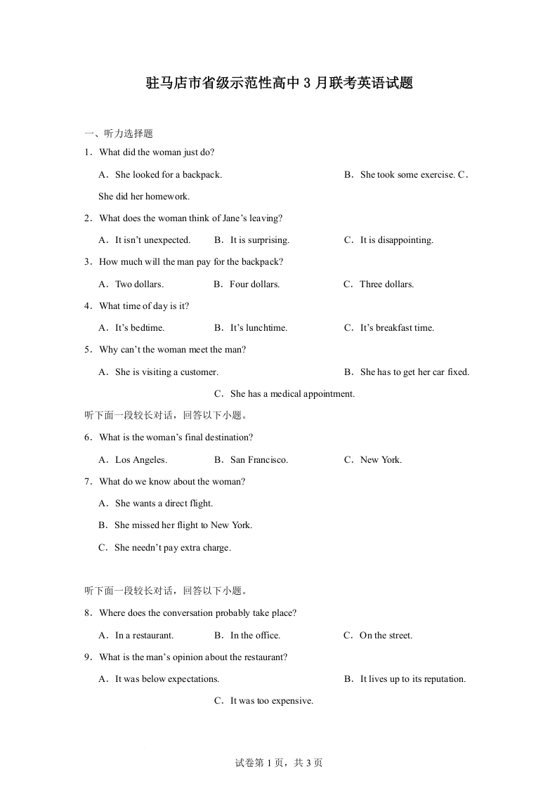 河南省驻马店市省级示范性高中2024-2025学年下学期3月高二联考英语+答案
