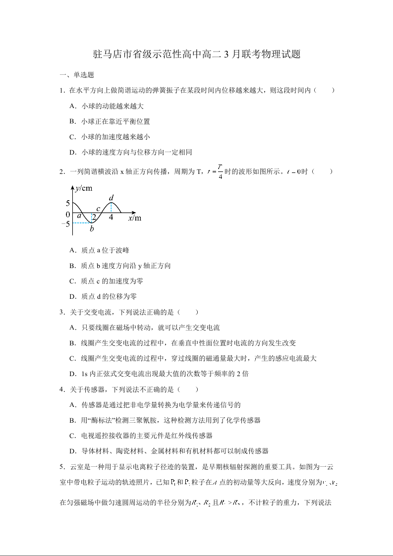 河南省驻马店市省级示范性高中2024-2025学年下学期3月高二联考物理+答案
