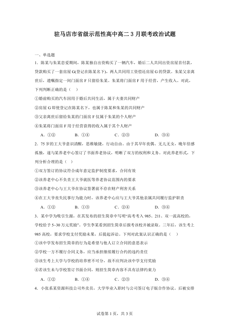 河南省驻马店市省级示范性高中2024-2025学年下学期3月高二联考政治+答案