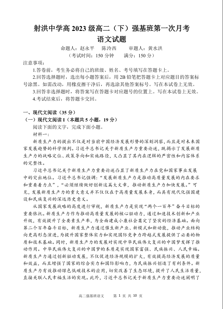 四川省遂宁市射洪中学强基班2024-2025学年高二下学期3月月考语文