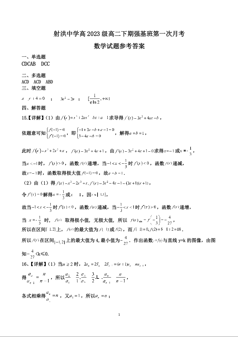 四川省遂宁市射洪中学强基班2024-2025学年高二下学期3月月考数学答案