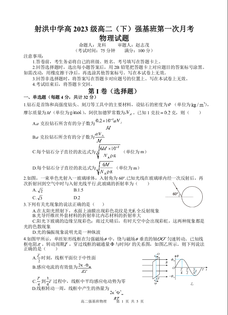 四川省遂宁市射洪中学强基班2024-2025学年高二下学期3月月考物理