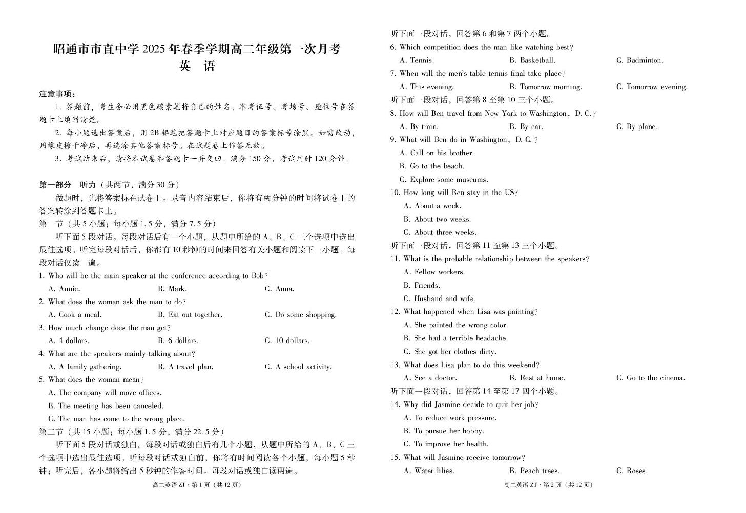 云南省昭通市市直中学2024-2025学年高二下学期3月第一次月考英语+答案