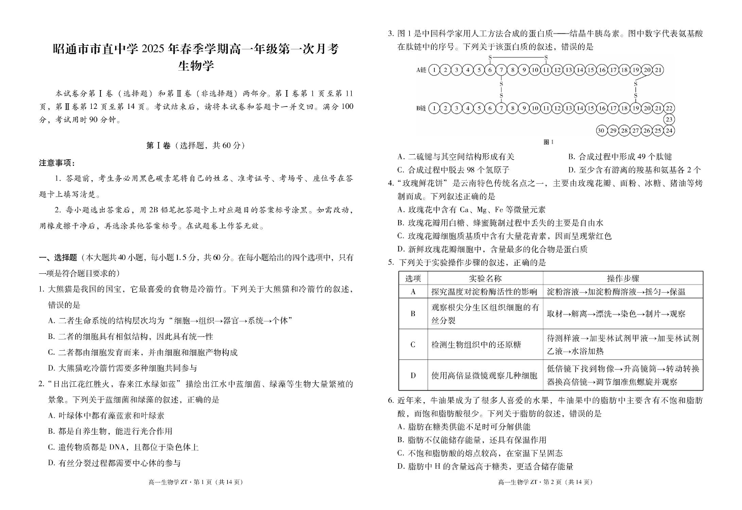 云南省昭通市市直中学2024-2025学年高二下学期3月第一次月考生物