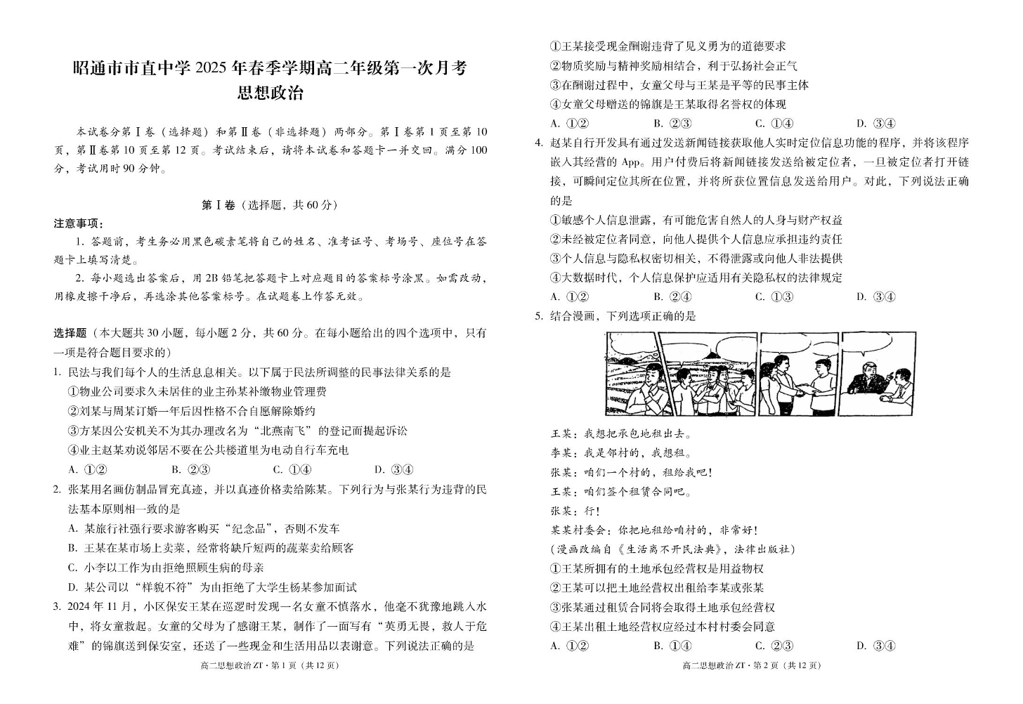 云南省昭通市市直中学2024-2025学年高二下学期3月第一次月考政治