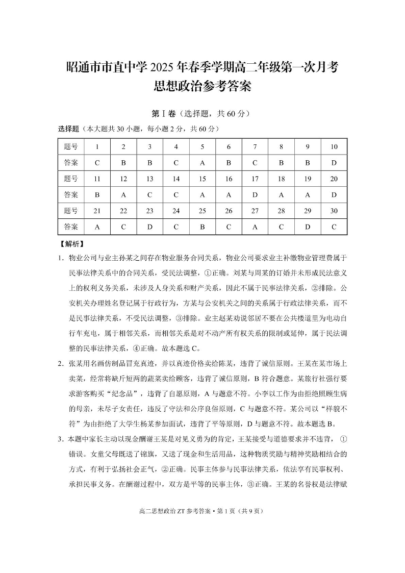 云南省昭通市市直中学2024-2025学年高二下学期3月第一次月考政治答案