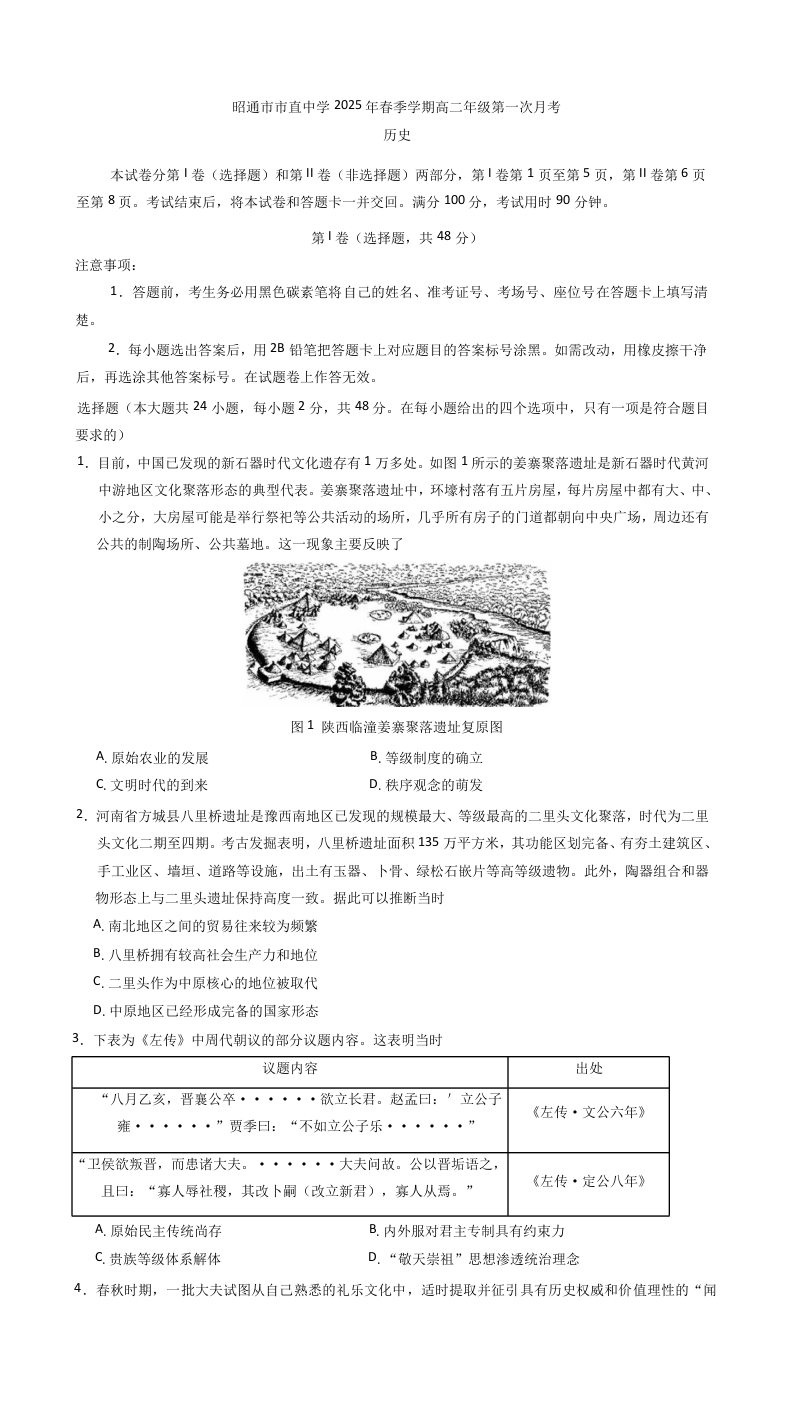 云南省昭通市市直中学2024-2025学年高二下学期3月第一次月考历史+答案