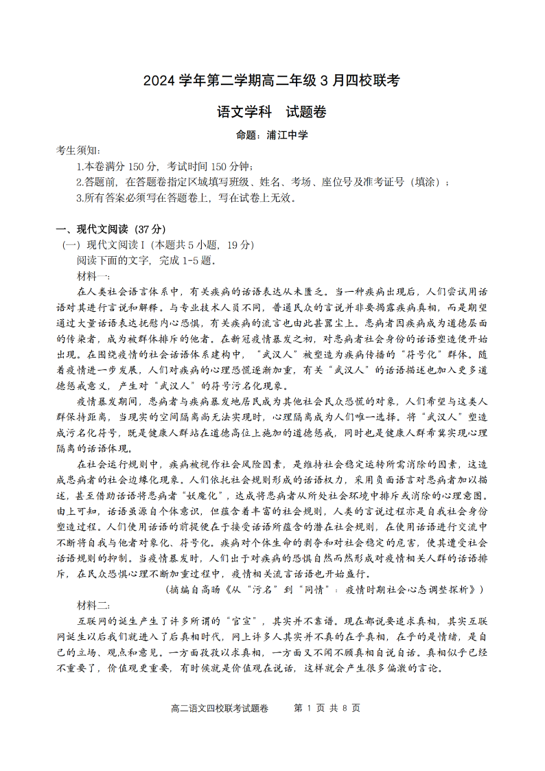 浙江省四校联盟2024-2025学年高二下学期3月联考语文+答案