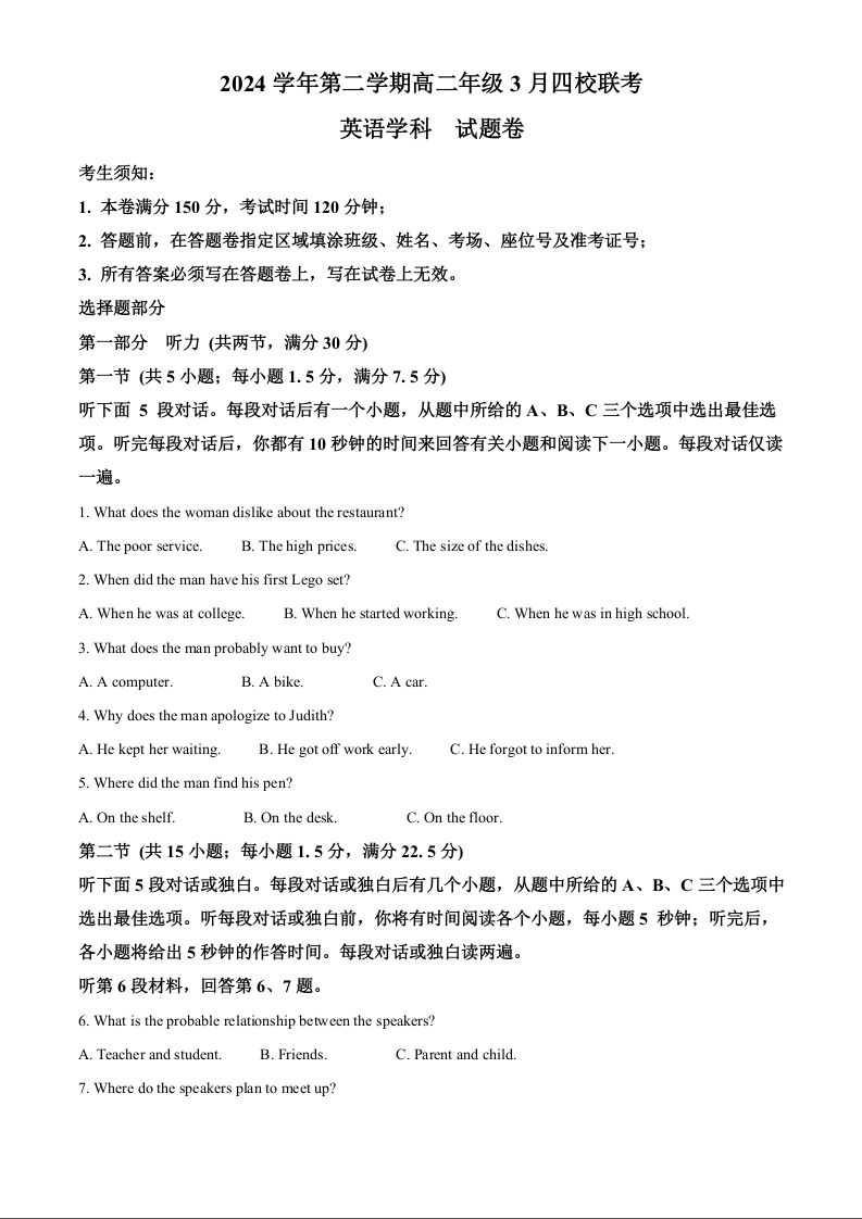 浙江省四校联盟2024-2025学年高二下学期3月联考英语+答案