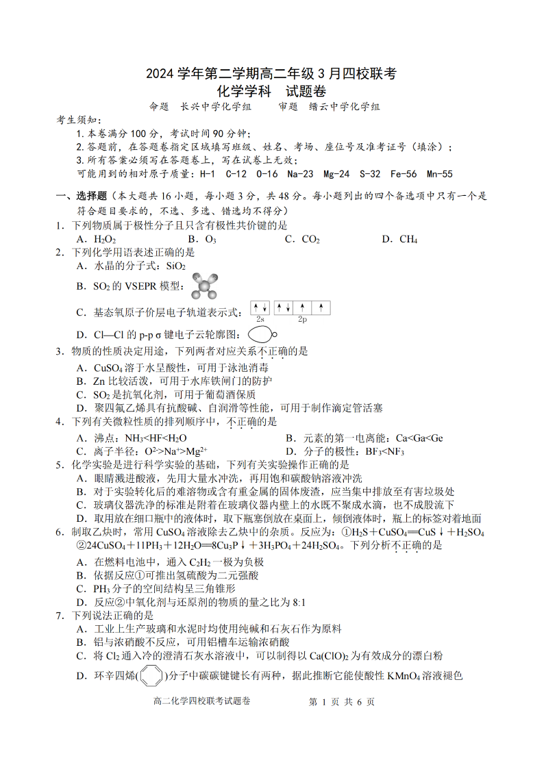 浙江省四校联盟2024-2025学年高二下学期3月联考化学+答案