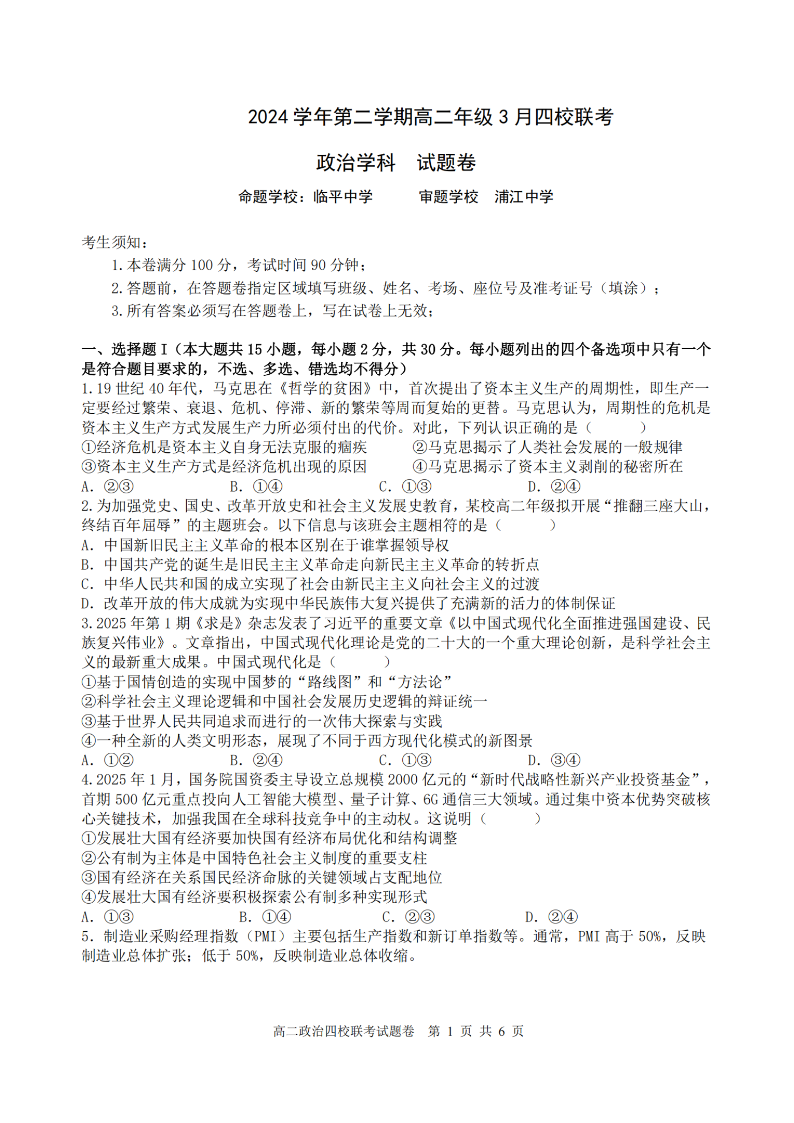浙江省四校联盟2024-2025学年高二下学期3月联考政治+答案