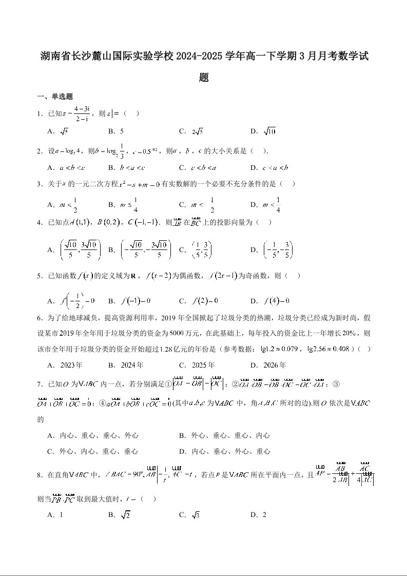湖南省长沙市麓山国际实验学校2024-2025学年高一下学期第一次学情检测数学+答案