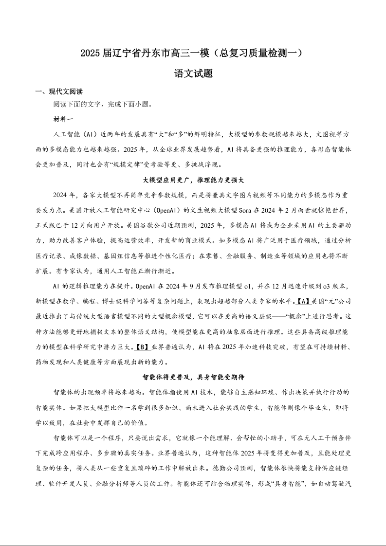 辽宁省丹东市2025届高三下学期3月总复习质量测试(一)语文+答案