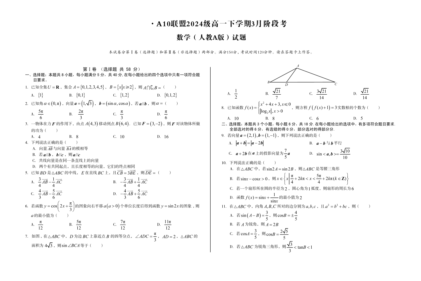 安徽省A10联盟2024-2025学年下学期3月高一阶段考试数学+答案