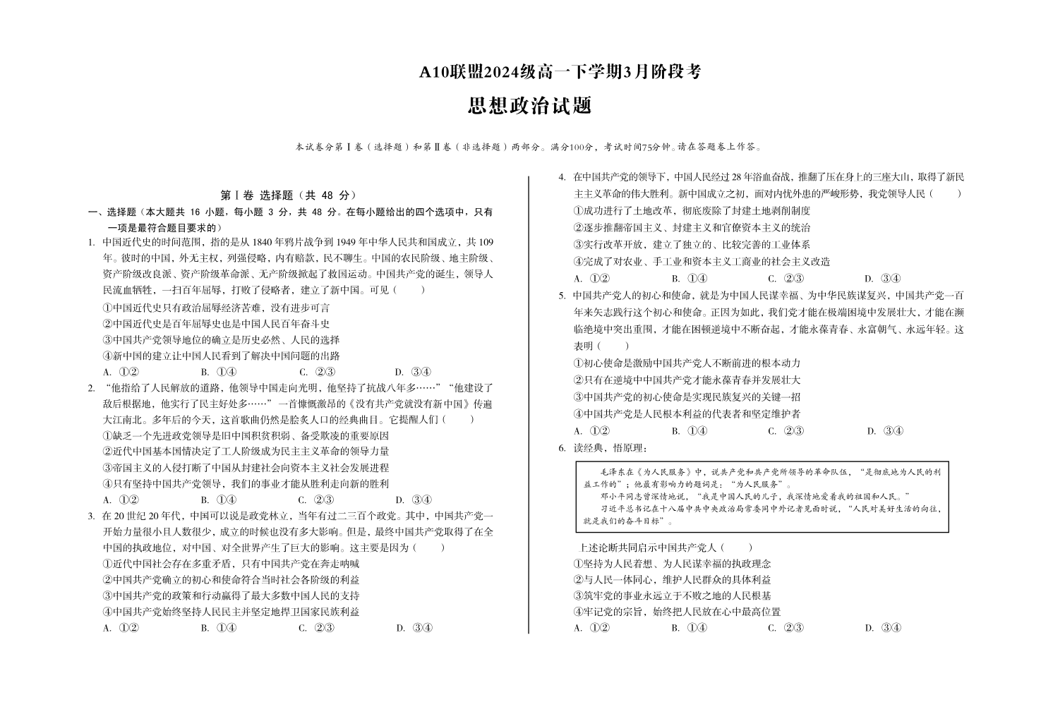 安徽省A10联盟2024-2025学年下学期3月高一阶段考试政治+答案