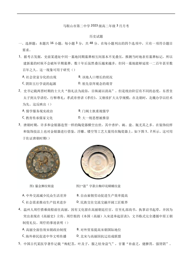 安徽省马鞍山市二中2024-2025学年下学期3月高二月考历史+答案