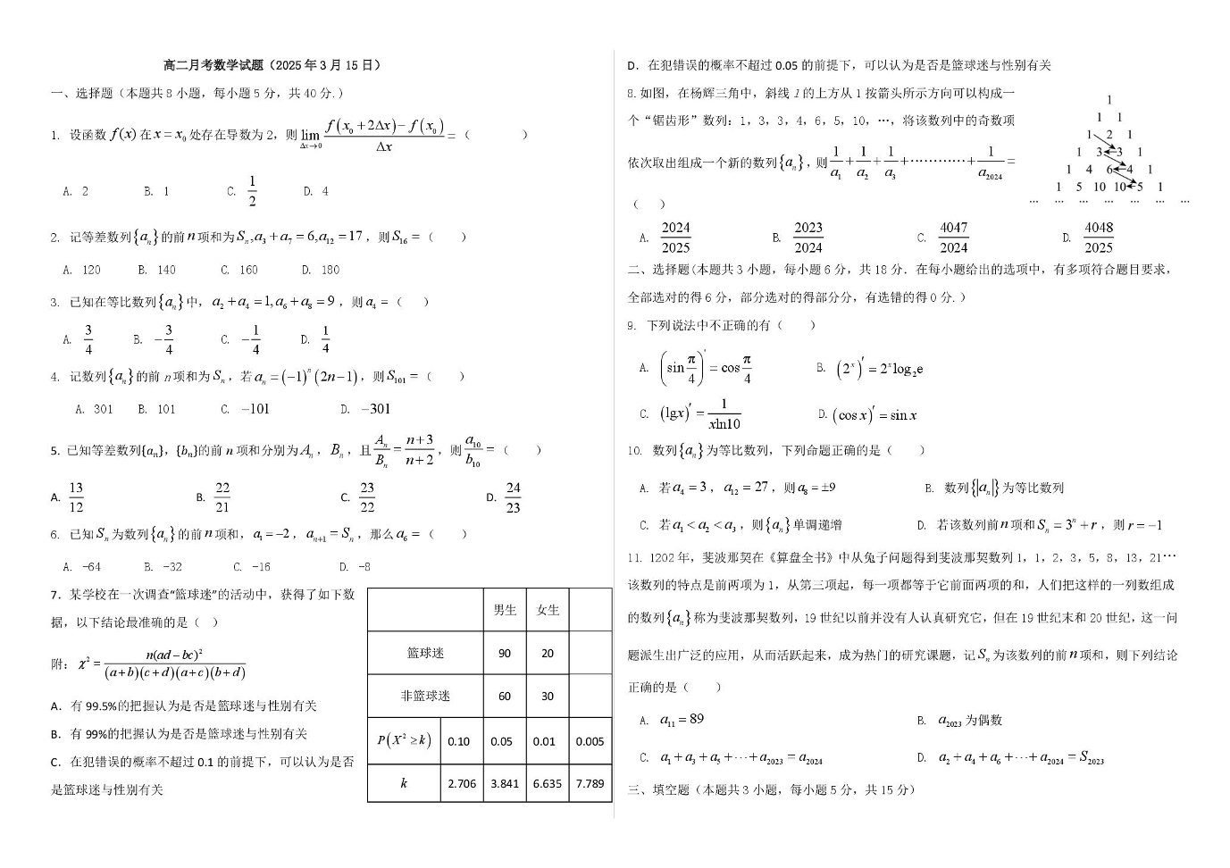 山东省德州市夏津一中2024-2025学年下学期高二第一次月考数学