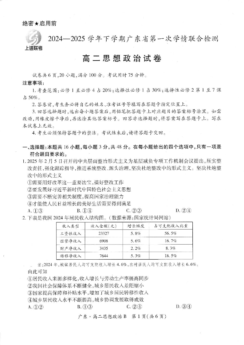广东省部分校2024-2025学年高二下学期第一次学情联合检测政治