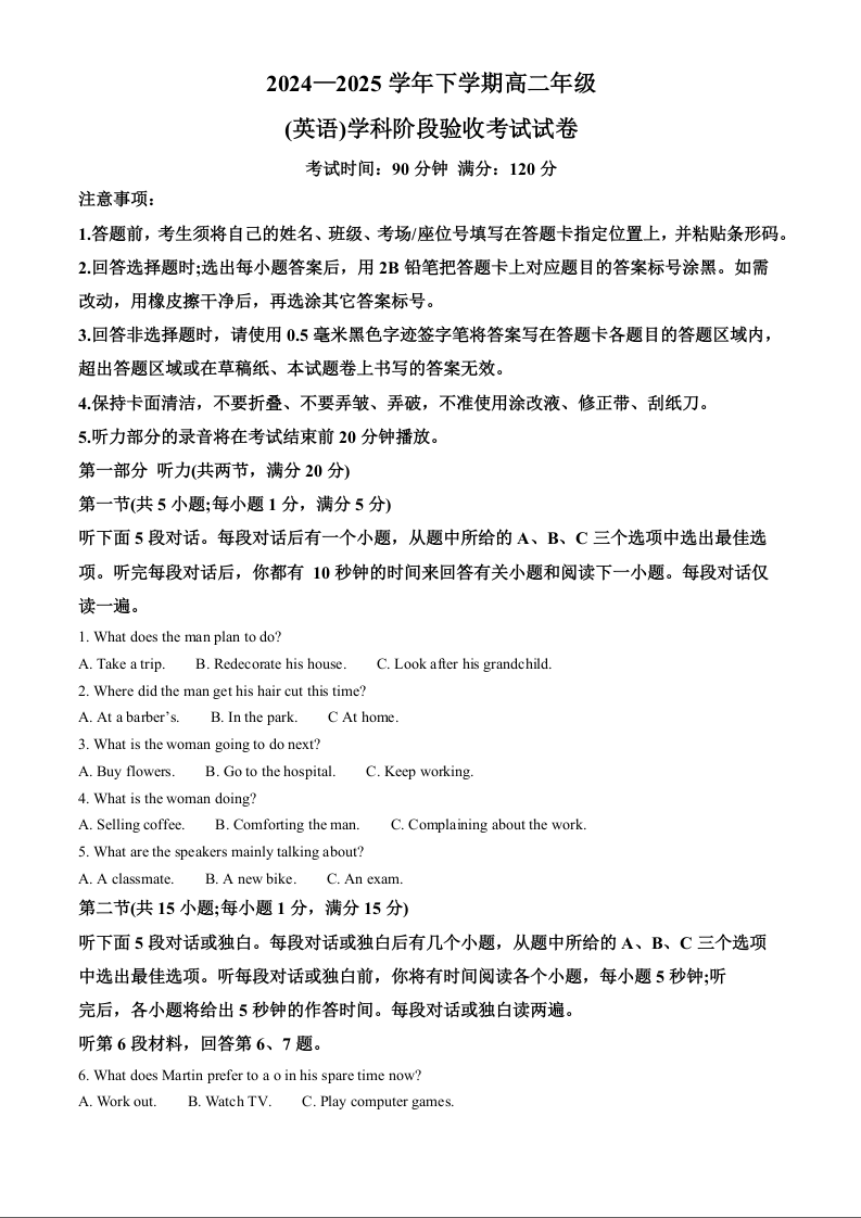 吉林省长春市东北师范大学附属中学2024-2025学年高二下学期3月月考试题英语(原卷版)
