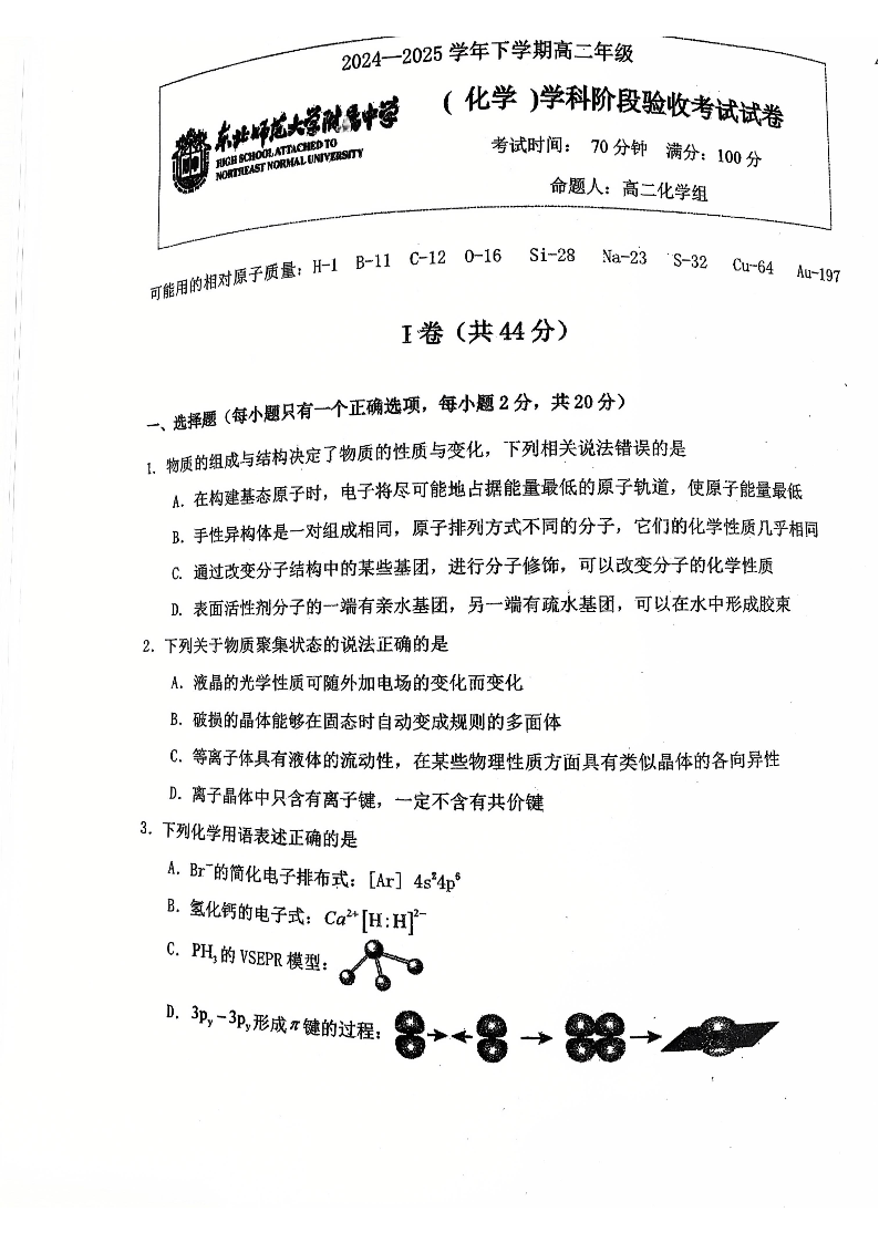 吉林省长春市东北师范大学附属中学2024-2025学年高二下学期3月月考试题化学