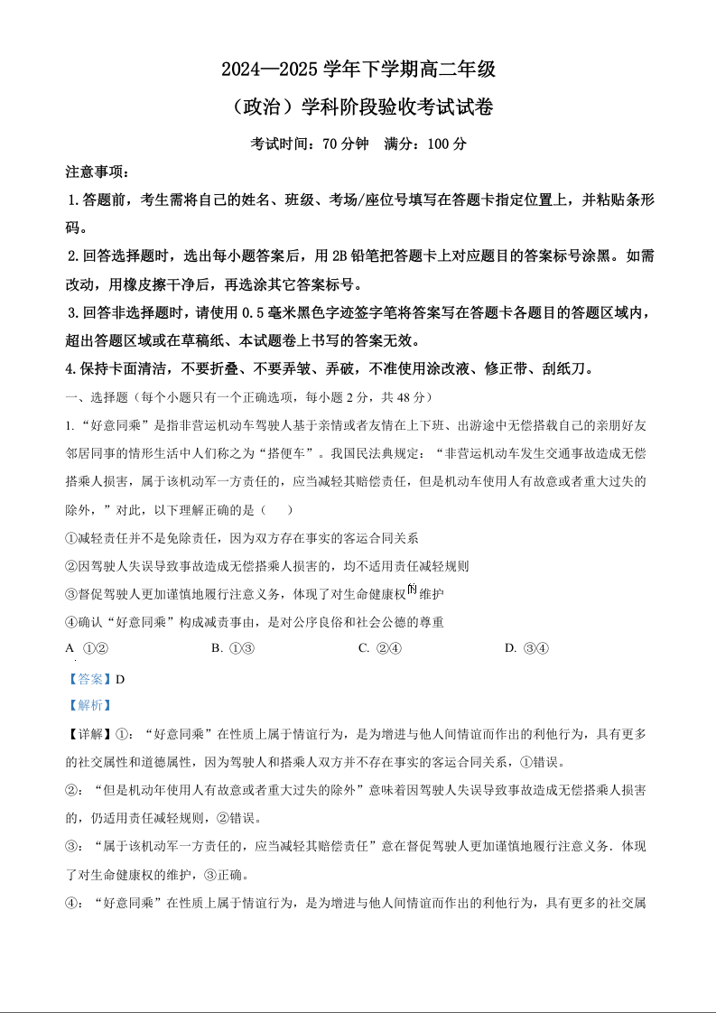 吉林省长春市东北师范大学附属中学2024-2025学年高二下学期3月月考试题政治(解析版)