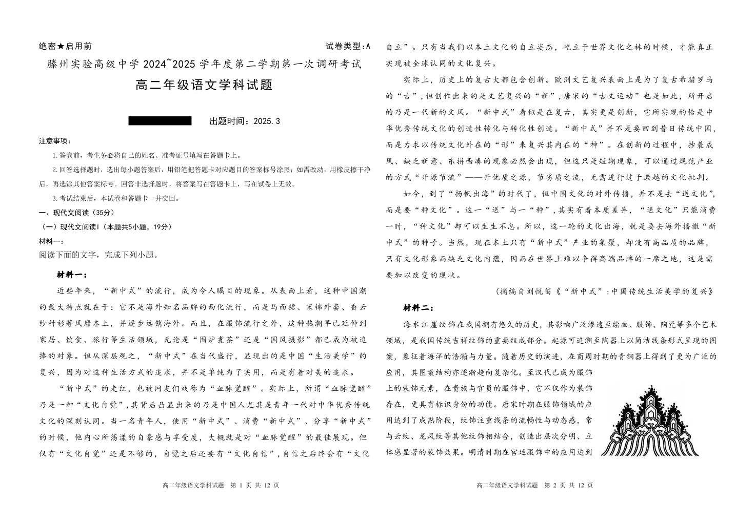 山东省枣庄市滕州实验高级中学2024-2025学年高二下学期第一次调研考试语文
