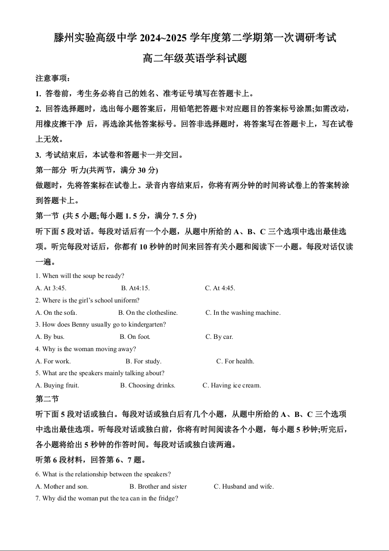 山东省枣庄市滕州实验高级中学2024-2025学年高二下学期第一次调研考试英语+答案