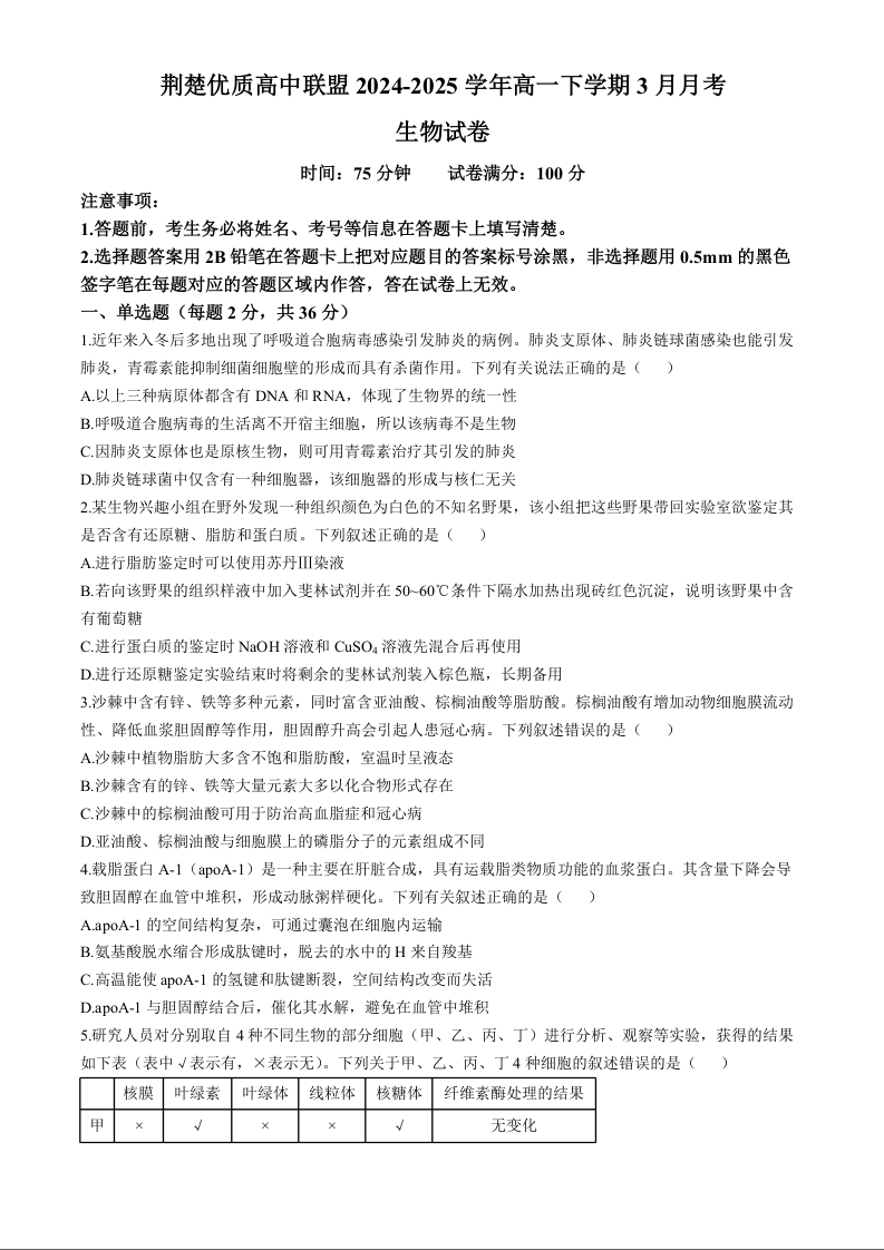 湖北省荆楚优质高中联盟2024-2025学年高一下学期3月月考生物+答案
