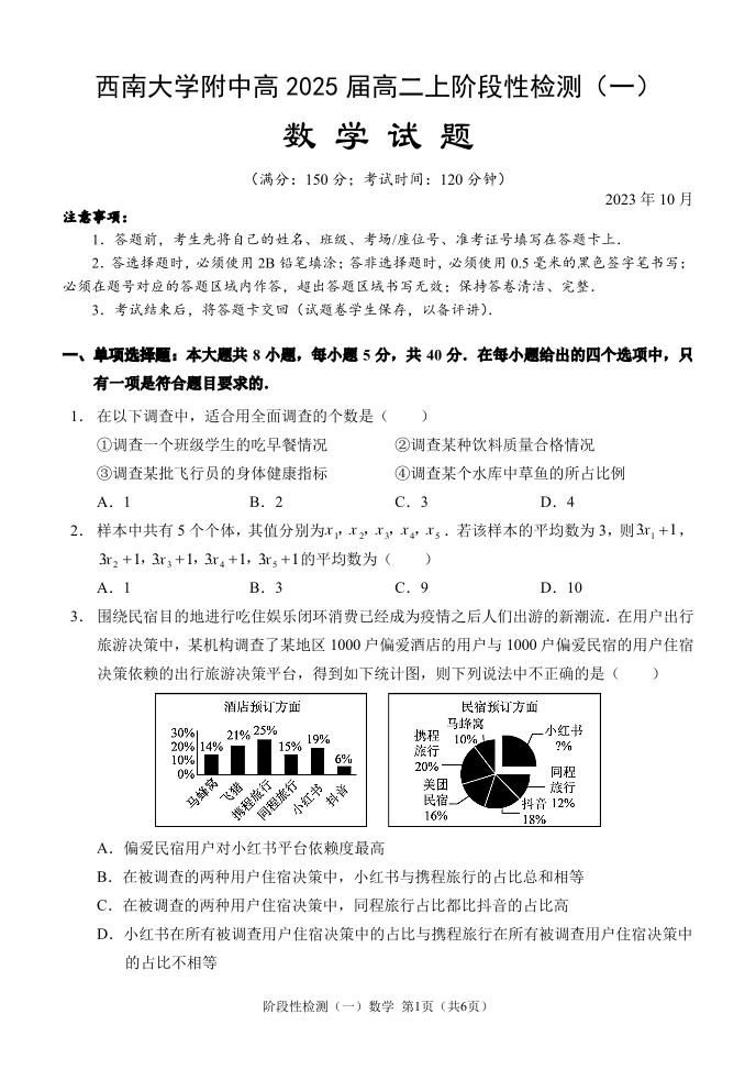 重庆市西南大学附中2023-2024学年高二上学期10月阶段性检测 数学