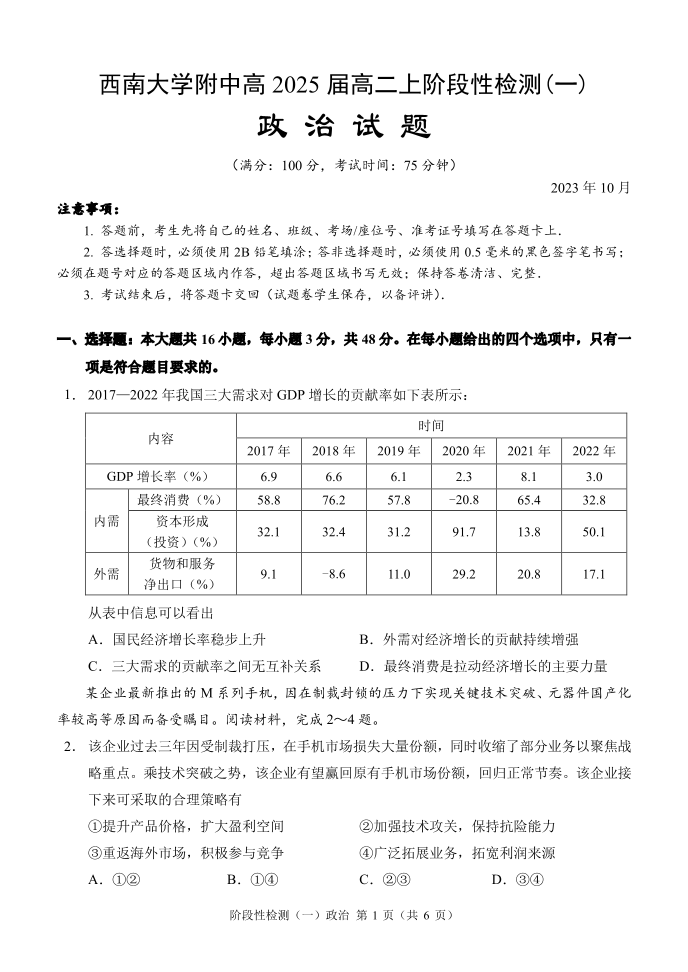 重庆市西南大学附中2023-2024学年高二上学期10月阶段性检测 政治