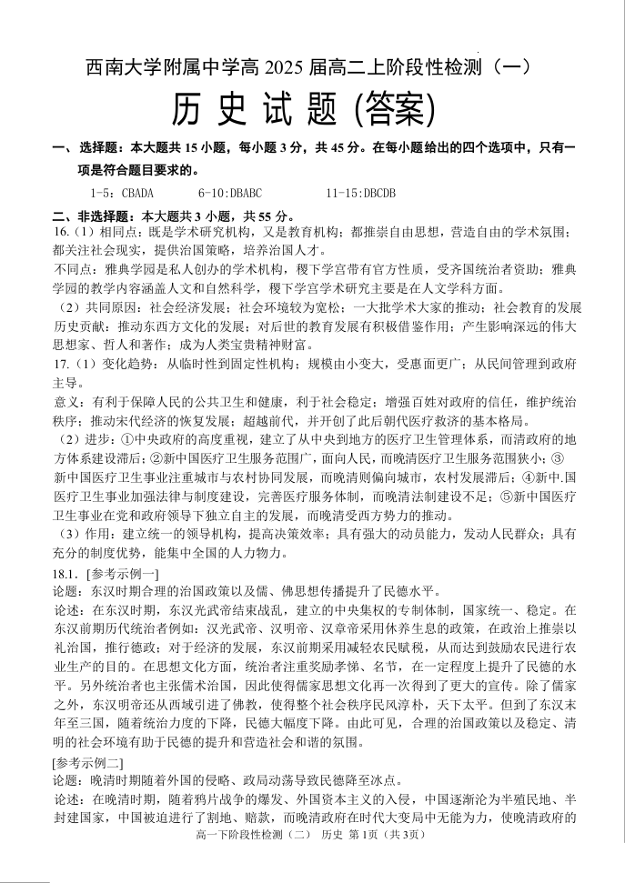 重庆市西南大学附中2023-2024学年高二上学期10月阶段性检测 历史答案