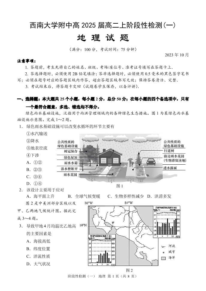 重庆市西南大学附中2023-2024学年高二上学期10月阶段性检测 地理