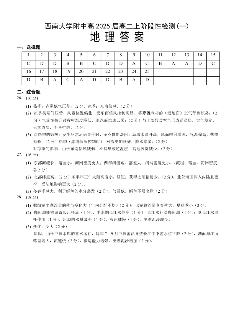 重庆市西南大学附中2023-2024学年高二上学期10月阶段性检测 地理答案