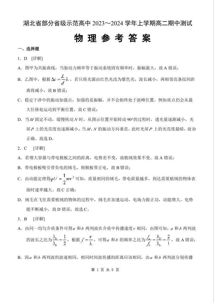 湖北省武汉市七校2023-2024学年高二上学期期中联考试题物理答案